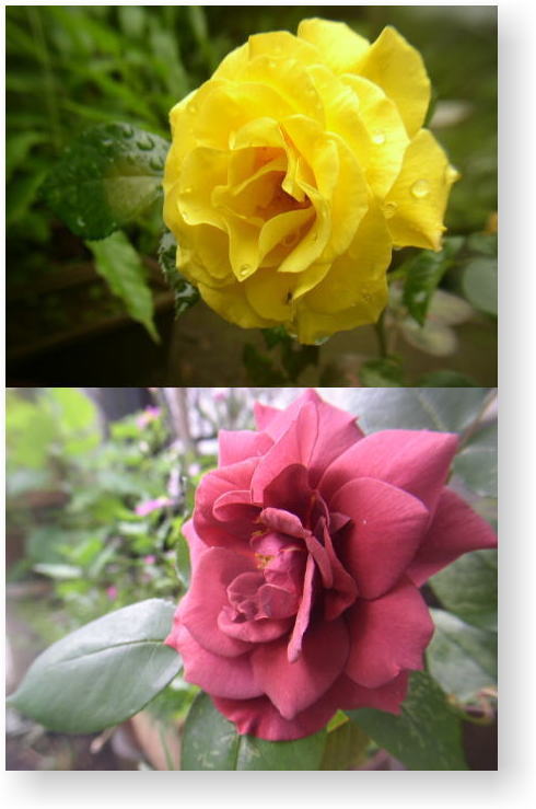 バラ 2種類 何故か気に入ったバラは 挿し木をしても中々付きませ ん。黄色のバラもその一つ でしたが、主人が友人に その話をしたら、わざわざ 挿し木をし、付いたものを 持ってきて頂いた大切な バラです。ここ2〜3年元気が 無く心配していましたが 久しぶりに咲きました!!! ほのかに香る甘い香りも 品よく漂っています♪☆・・・ 赤みを抑えたブラックティー と云う名のバラ。 3年前、西武の世界バラ展に 行った時購入したものです。 華やかなバラの中でシックな 色合いが気に入って買いまし た。備前焼の一輪挿しに よく合います。 |